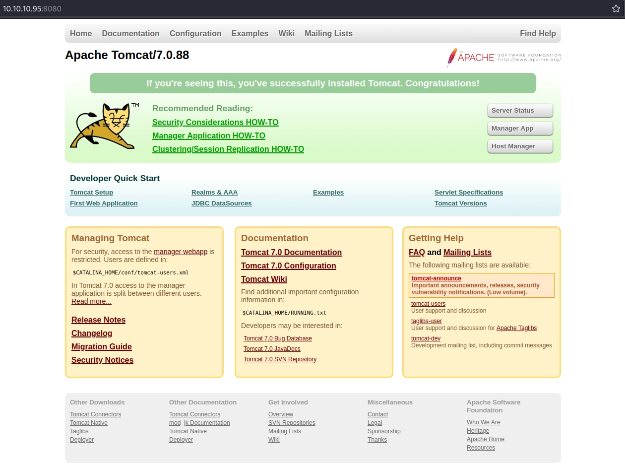 Si nos dirigimos al directorio http://10.10.10.95:8080/revshell/ la reverse shell se nos ejecutará y la recibiremos en el listener que hemos establecido previamente.